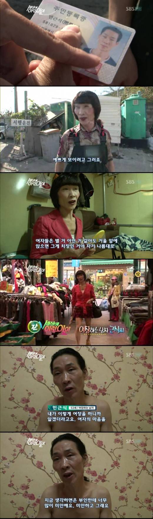 18일 방송된 SBS '순간포착 세상에 이런 일이'(이후 순간포착)에서는 여장하고 다니는 남자 민근식(53)씨의 사연을 다뤘다.