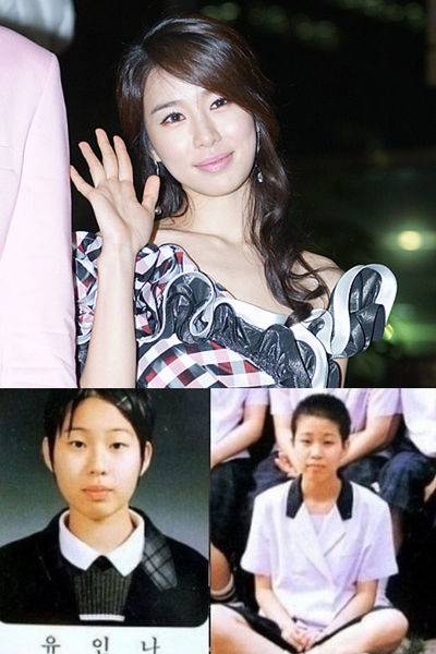 유인나의 과거 사진에는 교복치마에 양반다리를 한 채 반삭발을 한 유인나의 과거모습이 그대로 드러나 있다. 현재의 청순한 외모와는 전혀 다른 모습이다.