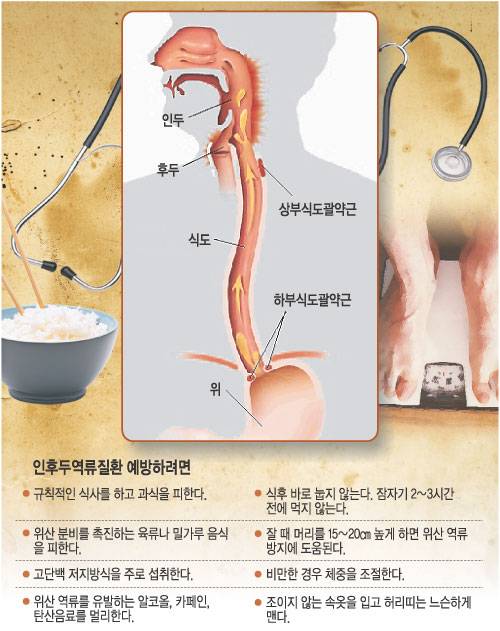 직장인 조모(46·여)씨는 최근 목이 꺼끌꺼끌하고 잔기침이 자주 나며 목소리가 약간 변하는 증상을 겪었다. 가벼운 목감기 쯤으로 생각하고 10일간 종합 감기약을 복용하며 지냈으나 차도가 없어 인근 병원 이비인후과를 찾았다. 후두 내시경으로 목 안을 들여다 본 결과, 뜻밖에도 '인후두역류증'이란 진단을 받았다. 이 병은 위에서 분비되는 위산이 식도를 타고 성대와 목 부위(인·후두)까지 거슬러 올라와 약한 점막에 염증을 일으켜 생긴다. 바이러스나 세균 등에 의해 생기는 목감기와 발생 원인부터가 다르다.