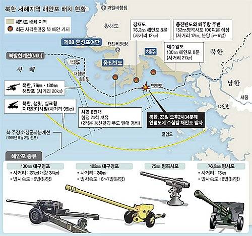 23일 북한이 인천 연평도를 향해 해안포를 발사한 곳은 연평도에서 불과 4㎞ 떨어진 개머리 해안포 기지로 알려졌다. 거리로 볼 때 연평도의 웬만한 지역은 개머리 기지에서 쏘는 해안포의 유효 사거리 안에 들어 있다. 황해도 해주항으로 들어가는 입구에 있는 개머리 기지는 북한 해안포가 밀집돼 있는 지점이다.