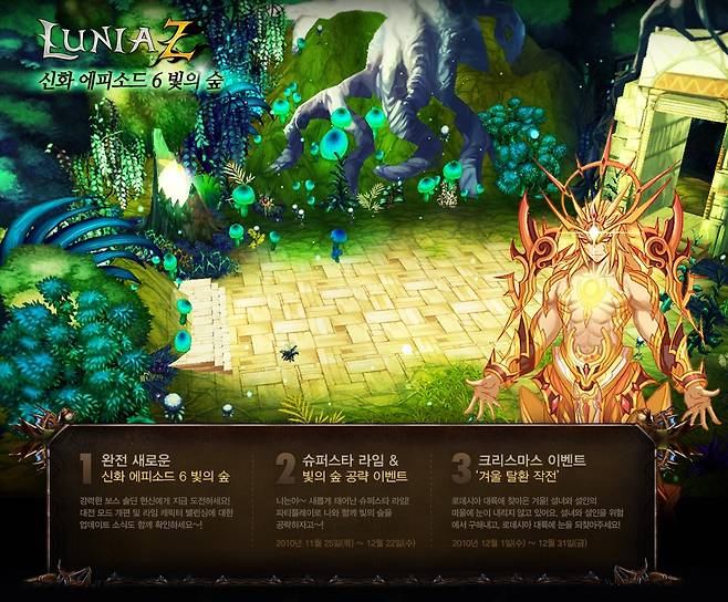 넥슨(대표 서민)은 올엠(대표 이종명)이 개발하고 자사가 서비스 중인 아케이드RPG 루니아Z(구 루니아전기)에 신규 스테이지인 신화 에피소드6 '빛의 숲' 외 다양한 업데이트를 실시한다고 최근 밝혔다.