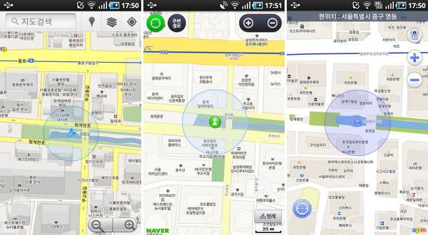 국내 스마트폰에서 많은 사용이 되고 있는 3개의 지도를 비교해봤다. 네이버, 다음, 구글지도 이렇게 3종이다. 구글의 경우엔 아이폰, 안드로이드폰 양쪽 모두에 기본 맵으로 들어가 있고 다음, 네이버 지도는 사용자가 마켓에서 직접 내려 받아야 한다.