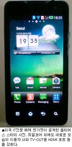 1일 관련업계에 따르면, `스타'라는 프로젝트명이 붙은 LG전자의 최고급 사양 안드로이드 스마트폰(가칭 옵티머스 스타)이 국내외 여러 웹사이트들을 통해 잇따라 유출되고 있는 가운데, 이 제품은 국내에서는 SK텔레콤을 통해 내년 초 가장 먼저 출시될 것으로 예상된다.
