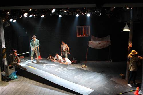 서울 대학로 게릴라극장 무대 위에 올려진 연극 '길바닥에 나앉다'의 극중 시간은 어느 날 아직 어둠이 걷히지 않은 새벽. 도시 외곽의 한적한 주택가다.