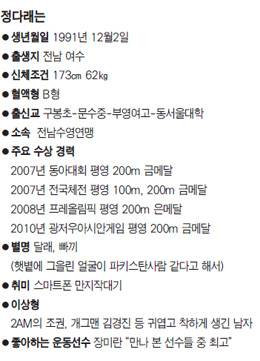 휴대폰 요금만 150만원이 나왔다. 건 적도 없고 받기만 했는데도 그랬다. 지난달 광저우아시안게임 여자 평영 200m에서 금메달을 딴 뒤. "너무 좋아요"라며 펑펑 울었던 정다래(19)는 이후 도무지 끊길 줄 모르는 축하전화 릴레이에 현지에서 행복한 몸살을 앓았다.