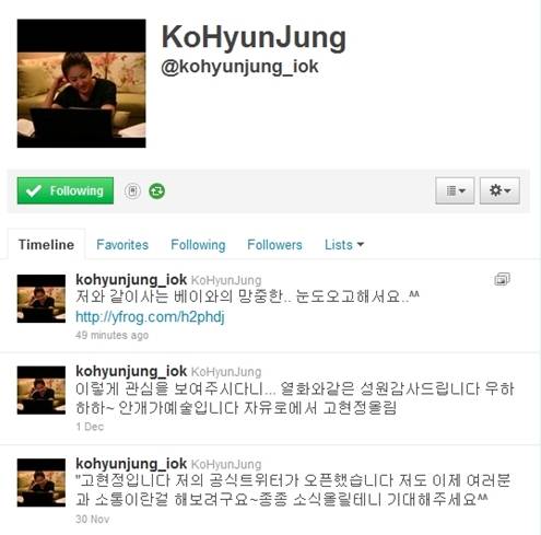 지난 11월 30일 처음 트위터를 시작한 고현정은 "고현정입니다. 저의 공식트위터가 오픈했습니다. 저도 여러분과 소통이란 걸 해보려고요. 종종 소식 올릴 테니 기대해주세요"라고 트위터 입성을 알려 팬들을 즐겁게 했다.