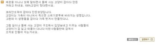 이에 해당 업체는 "우리가 흔히 보는 고양이 털은 아닌 것 같다. 아마 고양이과 동물털인 것 같다"고 해명하기도 했다. 또 다른 쇼핑몰에서는 "애완용이 아니니 걱정 마라. 들에 사는 고양이를 잡았다. 100% 고양이 맞다"고 답변, 이에 한 번 더 충격을 줬다.