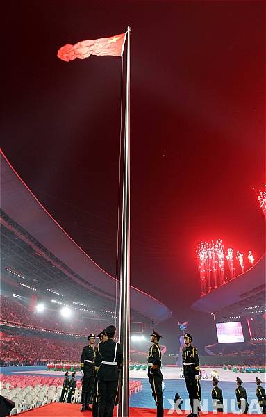 【광저우(중국 광둥성)=신화/뉴시스】12일 중국 광둥성 광저우에서 제10회 광저우 장애인 아시안게임(2010 Asian Para Game) 개막식이 열린 가운데 중국 국기가 게양되고 있다.