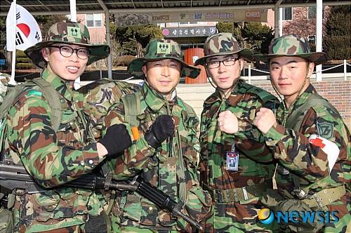【홍천=뉴시스】김성혜 기자 = 소중한 생명을 구한 육군 76사단 수색대대 장병과 군의관 이호진 중위(오른쪽 두번째)가 화이팅을 외치고 있다.(사진제공=육군 제76보병사단)< 관련기사 있음 >