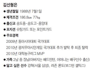 졸업반인 김선형은 내년 1월 말 열리는 프로농구 드래프트에 나선다. 김선형은 중앙대 07학번 동기생인 센터 오세근에 이어 전체 2순위 후보다. "프로에 가서는 강혁(삼성) 선배님처럼 화려하진 않아도 팀에 도움이 되는 선수가 되고 싶다"는 김선형은 "내가 강혁 선배님을 우러러보는 것처럼 누군가의 롤모델이 되는 게 꿈"이라고 했다.