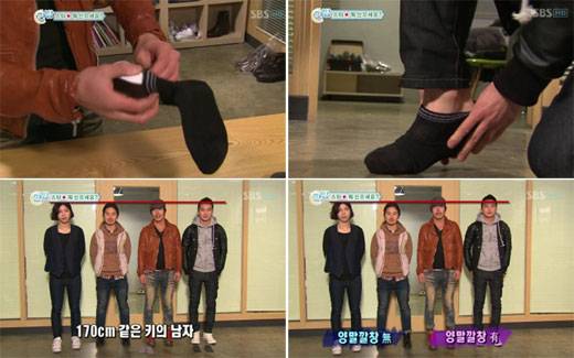 키높이 양말을 발명한 이민규 디자이너는 "연말모임을 앞두고 식당이나 모임장소에서 신발을 벗고 들어가도 들키지 않기 때문에 인기가 높다"며 "최근 키가 큰 연예인들도 애용하는 것처럼 '키높이양말'과 깔창이 허리에 착용하는 벨트처럼 패션 필수 아이템 되었다"고 설명했다. (사진출처: SBS '한밤의 TV 연예' 캡처)