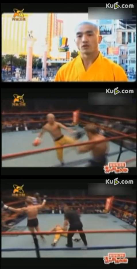 [연예팀] 소림사 승려가 미국 해병대 출신의 선수에게 2라운드 만에 KO패를 당하는 동영상이 화제다.