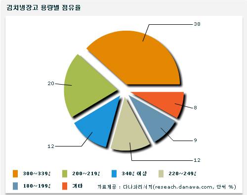 용량만 따지면 300ℓ 이상 제품이 잘 나간다. 다나와리서치 냉장고 판매자료를 보면 300ℓ 이상이 38%를 차지한다. 그 다음은 200~219ℓ짜리로 전체 판매량 중 20%를 차지한다. 스탠드형 같은 경우 냉장고 보조 역할로도 쓸 수 있기 때문에 큰 용량을 찾는 사람이 많다는 게 업계 관계자 설명이다.