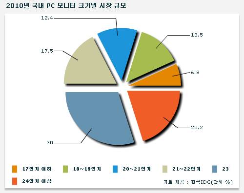 [쇼핑저널 버즈] 2010년 한 해 모니터 시장을 이끈 트렌드는 LED라고 할 수 있다. 물론 CES2010과 아바타 열풍으로 시작된 3D 열풍이 모니터 시장 초반에 이슈메이커 역할을 했고 스마트폰으로 시작된 터치스크린을 지원하는 모니터도 소비자 시선을 끌기도 했다. 디스플레이의 전통적 경쟁 도구인 두께를 줄인 슬림 모니터 역시 빼놓을 수 없다. USB 미니 모니터와 액자 겸용 제품도 마찬가지다.■ 대형화 추세 여전·가격은 '인치당 만원'올해를 주도한 모니터 화면 크기는 23∼24인치다. 모니터 화면은 올해도 늘어나는 추세를 유지했다. 2009년만 해도 주류는 8∼558.8mm(20∼22인치)였지만 올 시장은 584.2∼609.6mm(23∼24인치)가 주도했다.
