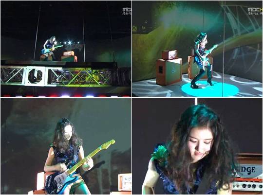 이날 애프터스쿨의 새 멤버 노이영은 기존 멤버들이 선보이는 '뱅' 무대 중간에, 단독으로 전자 기타를 연주하며 등장했다.