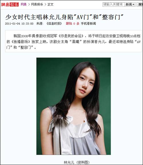 3일 중국 포털사이트 왕이가 ´소녀시대 멤버 윤아, AV 출연설 휘말려´란 제목으로 성인물 출연과 성형설을 제기했다.