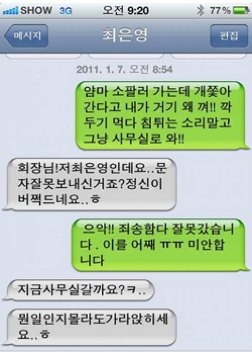 이 글과 함께 올린 캡처 사진 속에서 박용만 회장은 "얌마 소 팔러 가는데 개 쫓아간다고 내가 거기 왜 껴!! 깍두기 먹다 침 튀는 소리 말고 그냥 사무실로 와!"라고 막말을 하자 최은영 회장은 "회장님! 저 최은영인데요. 문자 잘못 보내신 거죠? 정신이 번쩍 드네요"라고 당황스러운 듯 답장을 보냈다.