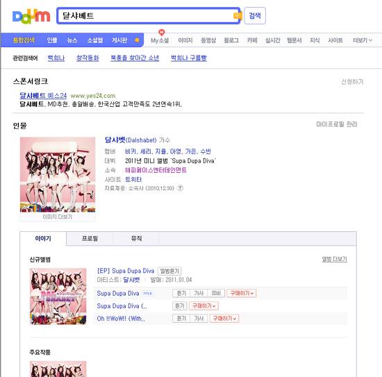 ▲ 포털사이트 다음에 '달샤베트'라는 단어를 입력하면 걸그룹 달샤벳의 검색 결과가 나온다.