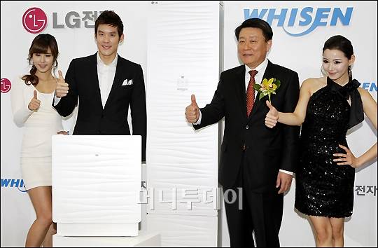 LG전자 휘센 에어컨 모델 수영선수 박태환(사진 두번째)과 AE 사업본부장 노환용 사장이 12일 오전 서울 서초구 양재동 LG R & D 사옥에서 열린 '2011년형 LG전자의 휘센 에어컨 신제품 발표회'에 참석해 포즈를 취하고 있다.
