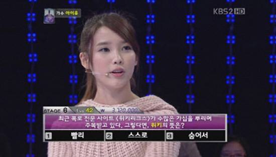이날 아이유는 '폭로 전문 사이트 위키리크스에서 위키의 뜻은?'이란 객관식 문항에서 정답인 '빨리'가 아닌 '숨어서'를 택했다. 아이유는 적립금 372만원에 대해 "할머니께 선물을 사고 싶다"고 말해 출연진의 박수를 받았다.