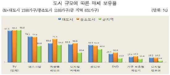소득이 높고 도시 지역일수록 디지털 매체(PMP, DVD 등) 보유대수가 많은 것으로 나타났다. 특히 인터넷, 디지털멀티미디어방송(DMB), 인터넷TV(IPTV)와 같은 신규매체 이용은 지상파방송 이용시간을 축소시키는데 영향을 미친 것으로 분석됐다.
