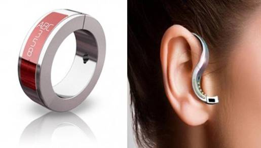 블루투스 반지형 이어폰도 곧 출시될 전망이다. 히브라 어드벤스 테크놀로지(Hybra Advance Technology)와 앱솔루틀리뉴(AbsolutelyNew)가 출시할 예정인 블루투스 반지 'O.R.B' (Orbital Ring Bluetooth) 가 그것이다. 이 블루투스 기기는 평소에는 반지처럼 손가락에 끼고 있으면 된다. 그러다 전화가 오면 진동과 함께 반지 겉면의 액정에 상대편 폰 번호가 뜬다. 전화를 받고 싶으면 반지를 빼서 귀에 걸면 된다. 일정이나 알람 설정도 가능하다. 모양도 제법 세련돼 테크파탈을 꿈꾸는 여성들에게 큰 인기를 끌 것으로 보인다. 가격은 129달러(약 14만4000원)로 책정될 전망이라고 한다.