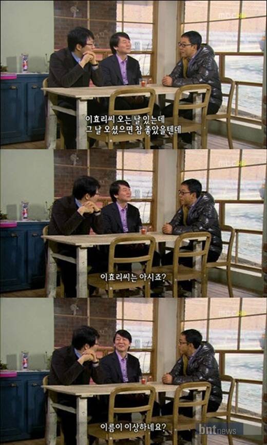 안철수 교수는 MC 김제동이 "이효리 씨 아시죠?"라고 묻자 "이름이 이상하네요"라고 말해 박경철과 김제동을 당황케 했다.