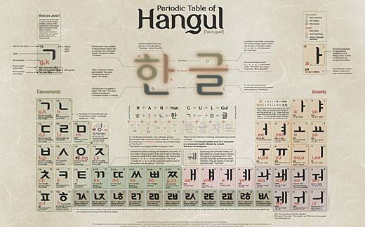 '한글 주기율표'는 한글을 자음과 모음으로 분류해 놓고 표기법, 소리, 조합 등을 한 눈에 볼 수 있도록 표로 정리한 것이다. 한글 창제의 과학성을 그대로 드러내고 있다.