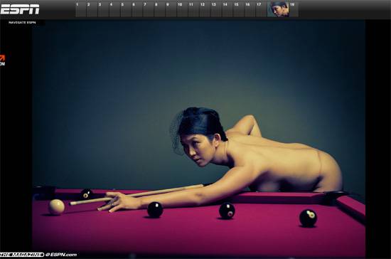 미국 ESPN의 특집기획을 통해 공개된 화보에는 실오라기 하나 걸치지 않은 전라의 '자넷 리'가 당구를 치는 포즈를 취하고 있다.