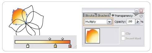 이제 꽃술을 아래 그림처럼 패스 툴을 이용해서 그려주고 그라디언트 색상을 그림과 같이 설정 후 'Linear Gradient'모드로 채워주고 Transparency pallate에서 Blend Mode를 'Multiply'로 선택합니다.