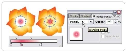 이제 꽃 중앙의 깊이있는 느낌을 주기위해 Ellipse Tool(원형 툴)을 이용해서 적당한 크기의 정원을 그리고 그림과 같이 그라디언트 색상을 채워준다음 Transparency pallate에서 Blend Mode를 'Multiply'로 선택합니다.