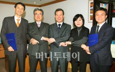↑홍선근 머니투데이 회장과 각 계열 대표들이 책임경영 계약 후 촬영을 하고 있다. 왼쪽부터 박종면 더벨 대표이사, 김상욱 머니투데이방송 대표이사, 홍선근 회장, 박정용 머니위크·대학경제 대표이사, 이백규 머니투데이 부사장. 사진=이동훈 기자 |