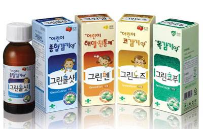 어린이용 종합감기약인 '그린콜샷 시럽'은 콧물ㆍ코막힘ㆍ재채기ㆍ인후통ㆍ기침ㆍ가래ㆍ오한ㆍ발열ㆍ두통ㆍ관절통ㆍ근육통 등 모든 감기 증상에 사용할 수 있으며 달콤한 딸기향을 첨가해 어린이들이 잘 먹는다.