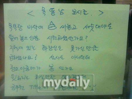 이 메모에는 "목똥남 보시죠. 목욕탕 바닥에 똥 싸놓고 세숫대야로 덮어 높으신 분 시원하셨던가요? 지척에 있는 화장실도 못가실 만큼 급하셨나요? 설사도 아니던데. 청소아줌마가 봉 인가요. 뒷처리는 하실만한 연세같은데. 공무원 Title이 아깝네요"라고 적혀 있다.