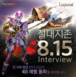 바른손게임즈에 따르면, '8.15'라는 아이디를 쓰고 있는 정은영 (44, 주부) 씨는 지난해 말 라그하임의 현재 최고 레벨인 400레벨을 달성, 지금까지 랭킹 1위를 유지하고 있다. 400레벨은 모든 서버에서 처음이라는 설명이다.