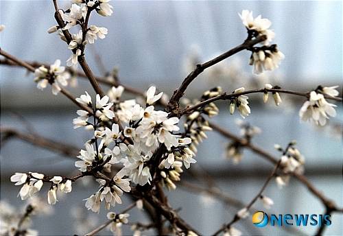 【괴산=뉴시스】강신욱 기자 = 6일 충북 괴산군 괴산읍 대사리 괴산분재농원의 수령 40년된 수양버들형 분홍 미선나무가 꽃망울을 터트려 특유의 그윽한 향기를 내뿜고 있다.