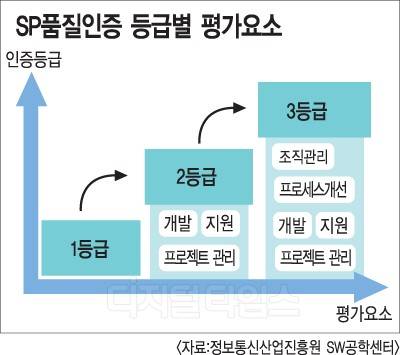 개발ㆍ지원ㆍ프로젝트 관리 등 3개 영역의 수준이 인정되면 2등급을 받는다. 또 이들 3개 영역에 더해 프로세스 개선ㆍ조직관리까지 총 5개 영역의 수준이 인정받으면 3등급을 받는다.