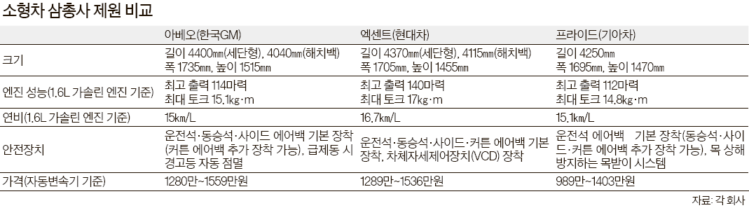 가격은 프라이드가 가장 싸다. 아베오 1.6 모델(수동변속기 기준) 가격은 1130만~1409만원이며 자동변속기를 선택하면 150만원이 추가된다. 엑센트는 자동변속기를 달았을 때 1289만~1536만원이다. 프라이드는 1.4L 4도어 모델(자동변속기 기준)이 989만원으로 1000만원 이하에서부터 시작한다. 가장 비싼 골드 프리미엄 모델은 1403만원이다.