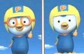 이 사진은 뽀로로 캐릭터가 안경을 쓴 모습과 벗은 모습을 비교해 놓은 것으로 확연히 달라진 이미지가 웃음을 준다.