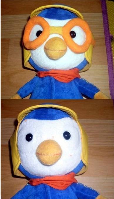 이는 뽀로로의 본래의 모습인 주황색 고글을 쓴 모습과 고글을 벗은 모습을 비교해 놓은 사진으로 안경을 벗은 뽀로로는 마치 '다른 캐릭터'처럼 보일 정도라 낯선 모습이다. 사진을 보면 안경을 벗은 뽀로로의 모습은 안경 자국 때문에 눈 주변이 볼록하게 튀어나왔고 눈이 상대적으로 작아 보인다.
