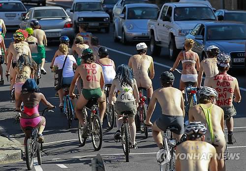epa02629307 South African cyclists take part in the World Naked Bike Ride (WNBR) in Cape Town, South Africa, 12 March 2011. The WNBR is a global event where cyclists protest against oil dependency and car culture. It is a celebration of the bicycle and also a celebration of the power and individuality of the human body that occurs across cities around the world. EPA/NIC BOTHMA < 뉴스의 새 시대, 연합뉴스 Live >< 모바일 애플리케이션 >< 포토 매거진 >< 저작권자(c)연합뉴스. 무단전재-재배포금지. >