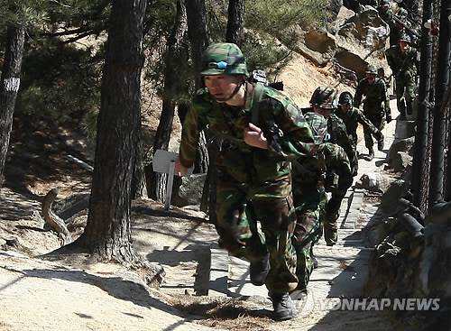 (서울=연합뉴스) 육군 수도방위사령부 장병들이 16일 천안함 피격 사건 1주기를 맞이해 조국을 지키다가 목숨바친 46명의 용사들과 고 한주호 준위의 군인정신을 본받기위해 영내 산악훈련장에서 소총을 휴대하고 5km 산악 급속행군을 하고 있다. 2011.3.16 < < 육군 > >