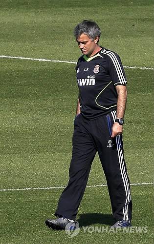 epa02664000 Portuguese coach of Real Madrid Jose Mourinho is pictured during the training session held at Valdebebas sports complex in Madrid, center Spain, 01 April 2011, in the eve of their next First Division League soccer match against Sporting. EPA/KOTE RODRIGO < 뉴스의 새 시대, 연합뉴스 Live >< 모바일 애플리케이션 >< 포토 매거진 >< 저작권자(c)연합뉴스. 무단전재-재배포금지. >