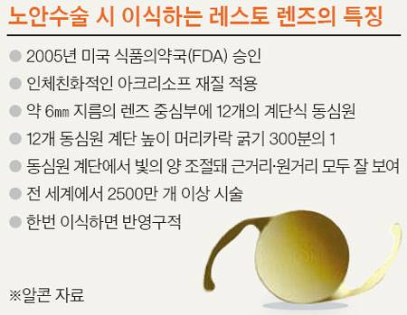렌즈는 3~4종류가 있다. 박영순 원장은 "미국 식품의약국(FDA)으로부터 유일하게 효능과 안정성을 인정받은 노안교정 특수렌즈(레스토)를 사용하면 근거리와 원거리를 동시에 볼 수 있다"고 말했다.