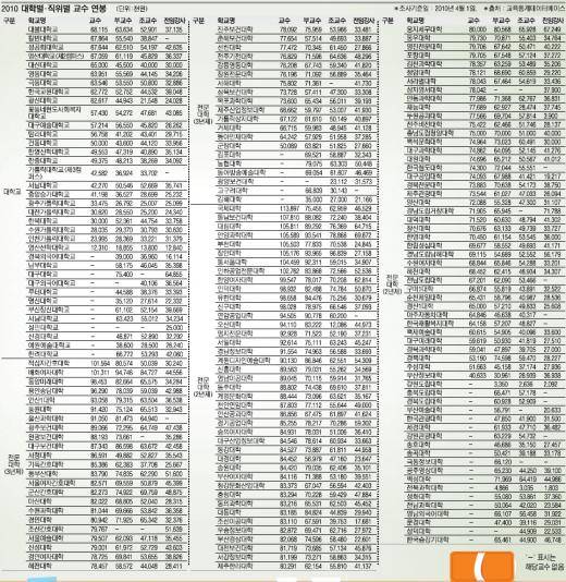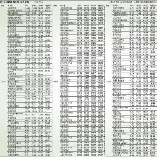 3일 교육과학기술부가 한나라당 김선동 의원에게 제출한 자료에 따르면 지난해 국내 대학 교수 중 최고 연봉자는 을지대의 정교수로 3억 1979만원이다. 이는 정교수 가운데 최저 연봉자인 인하대 교수(856만원)보다 37.4배, 연봉이 가장 적은 강남대 전임강사(148만원)에 비해서는 무려 216.1배 많은 것이다. 전임강사라고 해서 박봉에 시달리는 것만은 아니다. 4년제 대학 가운데 한양대의 전임강사는 1억 2039만원, 2·3년제 대학 중에서는 배화여대의 전임강사가 9317만원을 각각 받았다.