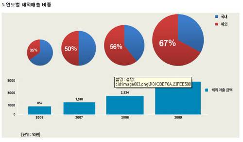 일찌감치 해외 진출을 시도한 넥슨은, 현재 미국, 일본, 중국 등 72개국에 진출해 있다. 해외 매출을 처음으로 별도 집계한 지난 2006년 35%였던 글로벌 매출 비중은 2009년 기준으로 67%까지 급증했다.