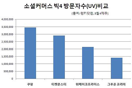 7일 웹사이트 순위분석기관인 랭키닷컴에 따르면 쿠팡은 3월 4주차 기준으로 순 방문자수(UV) 344여만명을 기록하면서 티켓몬스터(약 291만명)를 50만명가량 앞선 것으로 집계됐다. 같은 기간 쿠팡은 페이지뷰(PV) 기준으로도 7334만여회를 기록해 7039만여회를 기록한 티켓몬스터를 처음으로 제쳤다. 또다른 순위분석기관인 코리안클릭 기준으로도 쿠팡은 3월 한달 동안 순 방문자 수 약 975만명을 기록해 티켓몬스터(약 812만명)에 비해 160만명 가량 앞선 것으로 조사됐다.