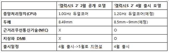 8일 삼성전자와 업계에 따르면 국내에 출시되는 갤럭시S 2는 근거리무선통신기술(NFC)과 지상파 DMB 등을 추가로 탑재하고 중앙처리장치(CPU)를 개선해 이달 말 선보인다. 하지만 두께는 다소 두꺼워지고 무거워질 것으로 보인다.