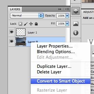 레이어 패널을 보면 아래 그림과 같이 작업 레이어가 보여지게 되는데요. 하단의 원본이미지를 손상 없이 여러 가지 필터나 효과를 주기 위해서 레이어 위에 마우스를 가져다 놓고 우측 버튼을 클릭한 다음 'Convert to Smart Object'를 클릭합니다.