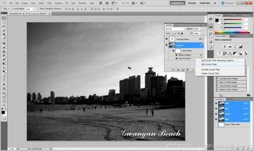 포토샵 도큐먼트에 아래와 같이 작업할 원본 이미지를 불러옵니다. 작년 여름 광안리 해변을 촬영한 이미지입니다. 이 사진을 원본 손상 없이 다양한 필터 효과를 주어 변화된 모습을 보고 싶은데 반복작업 없이 간단하게 할 수 있는 기능이 바로 스마트 오브젝트 레이어로 전환해서 작업하는 방법입니다.